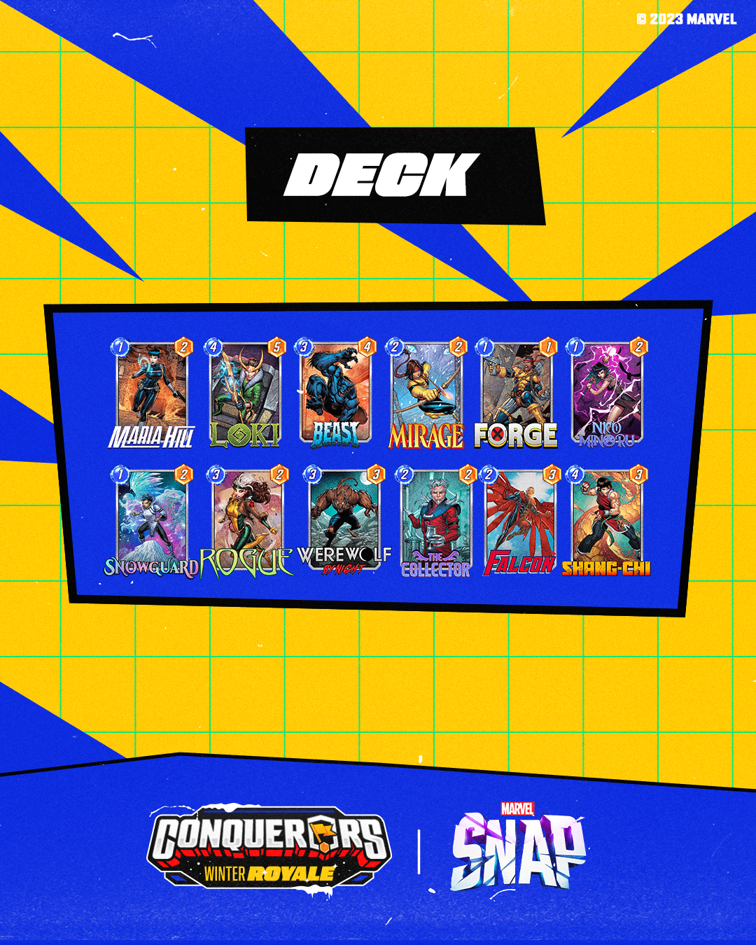 Leveraging the captivating card and variant illustrations from the "Hellfire Gala" season as a baseline, we crafted a dynamic series of graphics combining winter and holiday celebration elements with the classic CONQUERORS location shape, to create a modular system that can absorb a large variety of characters and elements without losing it's consistency and visual appeal.